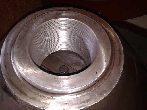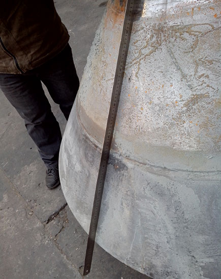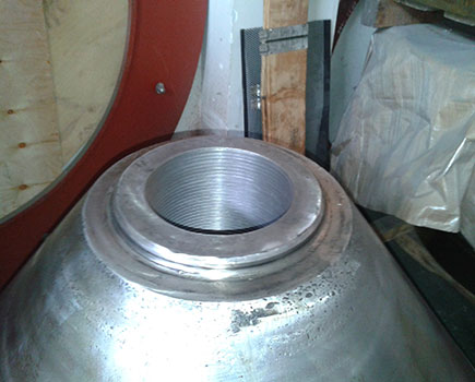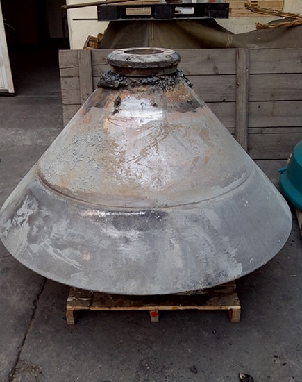 2014-06-10 客戶HP500 破碎機(jī)動錐體在更換襯板時發(fā)現(xiàn)鎖緊螺栓不能拆卸,運到我公司維修。由我司技術(shù)人員判定為動錐體內(nèi)螺紋損壞,同時檢查動錐體外錐面,發(fā)現(xiàn)磨損嚴(yán)重。