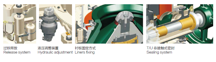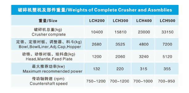LCH 系列圓錐破碎機(jī)只需更換定錐襯板、動錐襯板、適配環(huán)和楔塊螺栓,即可將破碎腔型在短頭超細(xì)到標(biāo)準(zhǔn)超粗之間任意轉(zhuǎn)換。